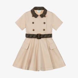 A sweet pink dress for baby girls by luxury Italian brand Fendi, finely knitted in luxurious wool. Elegant and simply styled with a gentle A-line shape, it has an inverted pleat down the front featuring the iconic FF logo pattern. The white rounded cotton collar, gathers on the shoulders and branded pearlescent button fastenings on the back add a lovely finishing touch.
