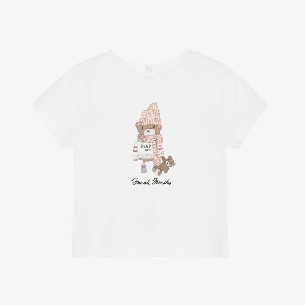 Ivory T-shirt for baby girls by luxury designer brand Fendi. The front has a cute 'Fendi Family' bear motif in pink and brown. Made in soft and comfortable cotton jersey, the top has back popper fastenings for easy dressing.