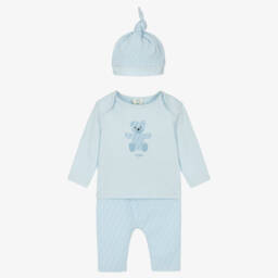 Fendi combines luxury and comfort with this delightfully soft, pale pink cotton jersey babygrow set for baby girls. A subtle, yet distinctive, tone-on-tone FF logo pattern and a cute teddy bear motif give it an adorable touch. The set includes a long-sleeved top with an easy-to-wear envelope neckline, a pair of pull-on trousers and a matching hat, packed in a useful branded pouch, making it a lovely gift for the new arrival.