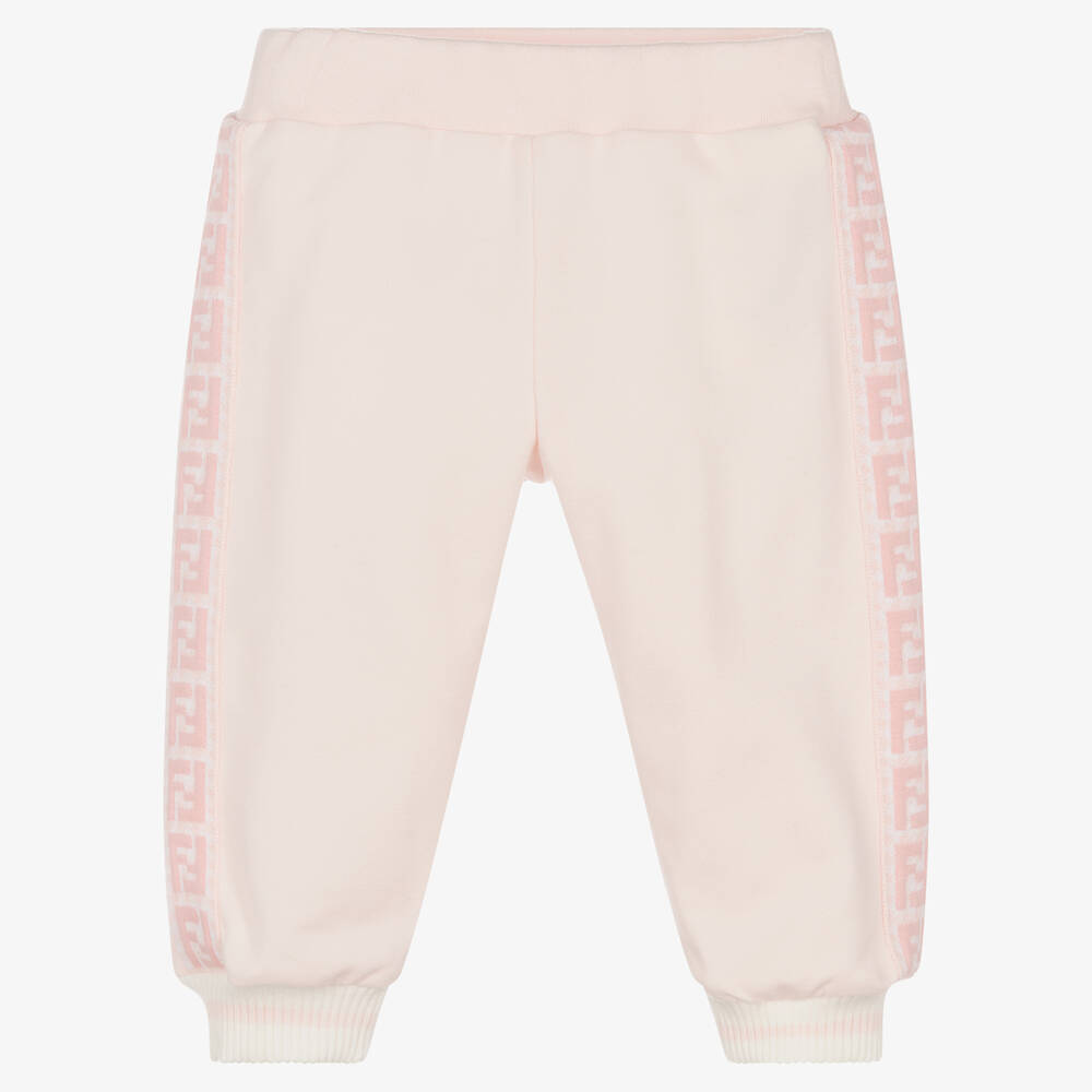 Pale pink joggers for baby girls by luxury Italian designer Fendi, with stand out FF logo taping along the sides of the legs in contrasting pink. They are made in stretchy cotton jersey with an elasticated waistband and white, ribbed cuffs for comfort.