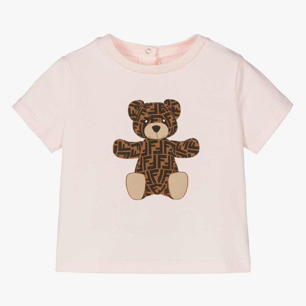 Adorable pale pink T-shirt for baby girls by luxury Italian brand Fendi. It has the Fendi teddy bear in the iconic brown FF monogram logo pattern printed on the front. Casual and comfortable, it is made from soft cotton jersey with logo branded pink poppers to fasten on the back.