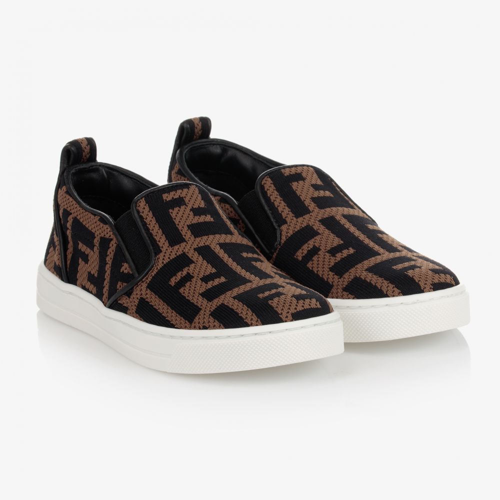 Smart knitted slip-on sneakers by luxury brand Fendi. In beige, the designer's signature FF logo is woven in black throughout the fabric, with leather trims and elasticated stretch panels for easy dressing. They are lined in leather, with a leather inner sole and a non-slip rubber outer sole.