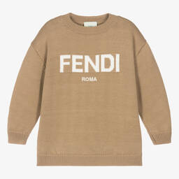 Simply stylish for boys and girls, this Mini-me beige jumper is from the Italian fashion house, Fendi. It is knitted in beautifully soft and luxurious virgin wool for cosy yet lightweight warmth. For a distinctive designer look, it has the Fendi Roma logo across the front in a white intarsia design with smaller embroidery below.