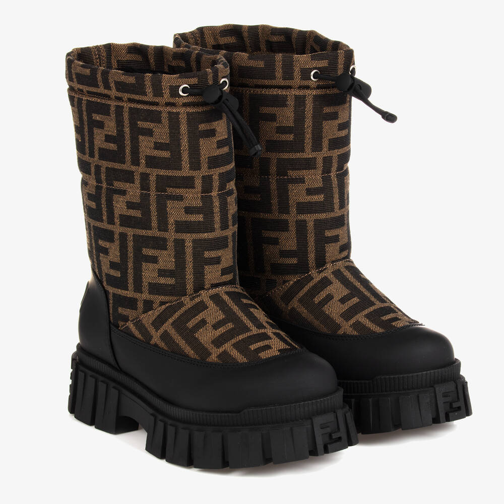 Luxury snow boots by Italian brand, Fendi, for boys and girls. The padded fabric shaft has an FF jacquard logo weave with a toggle adjustable top. There are reinforced waterproof leather trims and an embossed logo at the heel. They have a cleated rubber outer sole with a moulded logo. The interior is lined with real shearling and the footbed has a sheepskin lining to the toes for the ultimate in comfort and warmth.