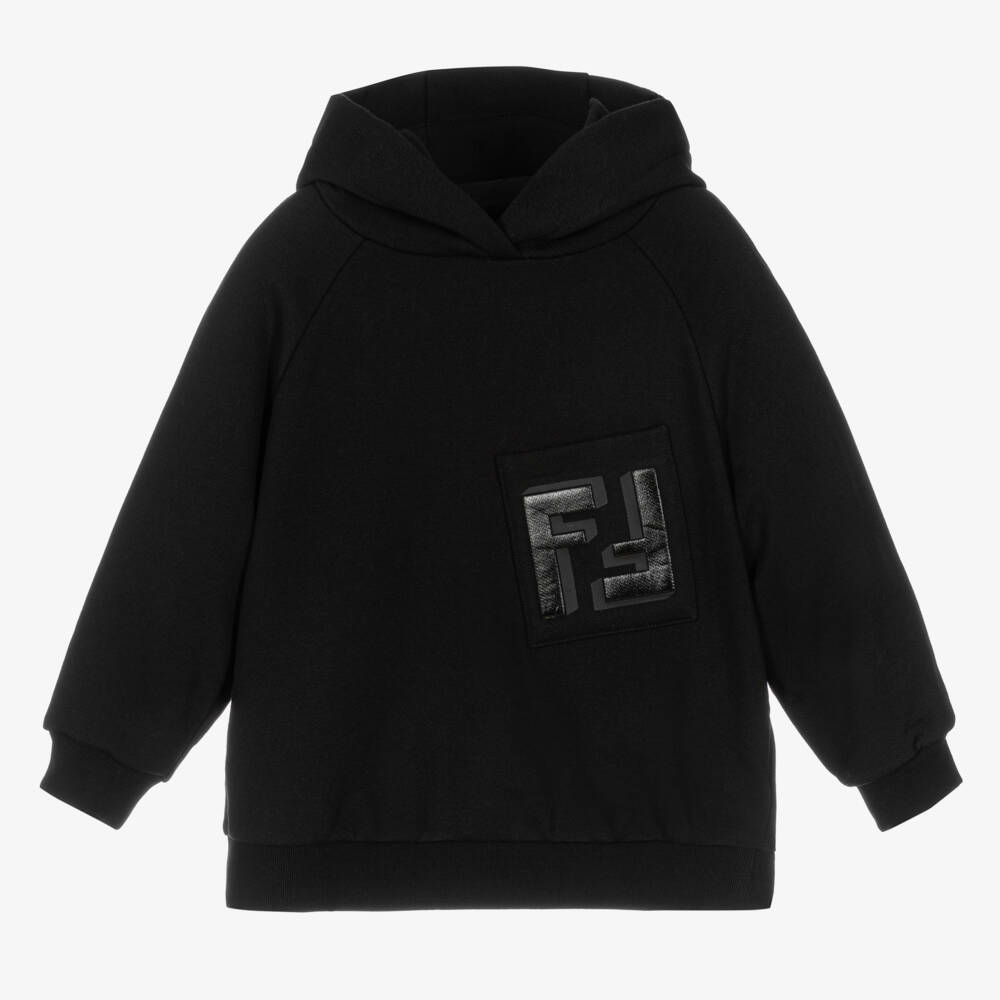 Black hoodie for boys and girls by Italian luxury brand Fendi, made in soft mid-weight cotton jersey. Designed with raglan sleeves, this cool and casual hoodie has a slanted pouch pocket on the front, accentuated with a shiny, raised FF logo for signature style.