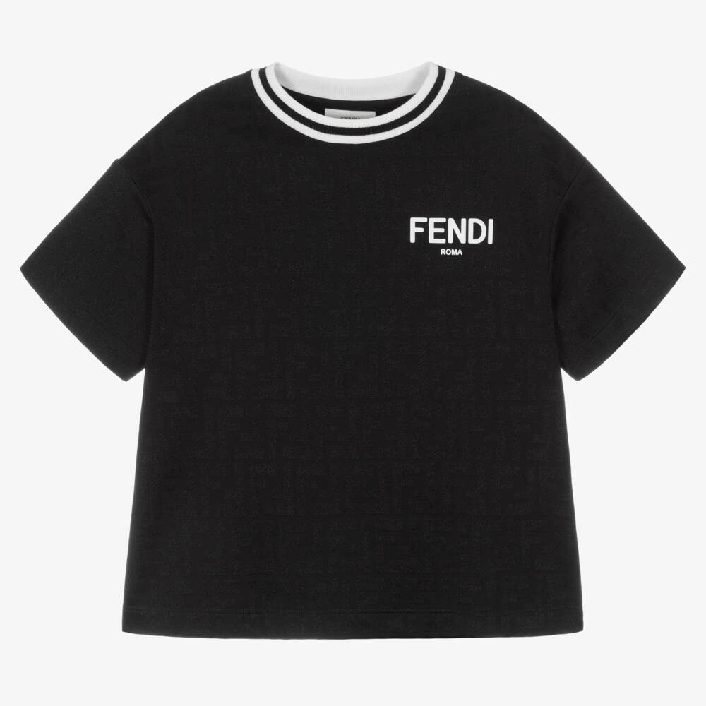 Boys and girls can make a style statement in this cool black T-shirt from Italian brand Fendi. Intricately crafted, the soft and smooth sports jersey fabric is enhanced by tonal jacquard FF branding, the luxury fashion house's signature motif. A bold white rubberised Fendi Roma logo is stamped on the front for a distinct designer look. This monochrome top is made in a stretchy cotton mix, with a sportswear-inspired stripy crew neckline for comfort.
