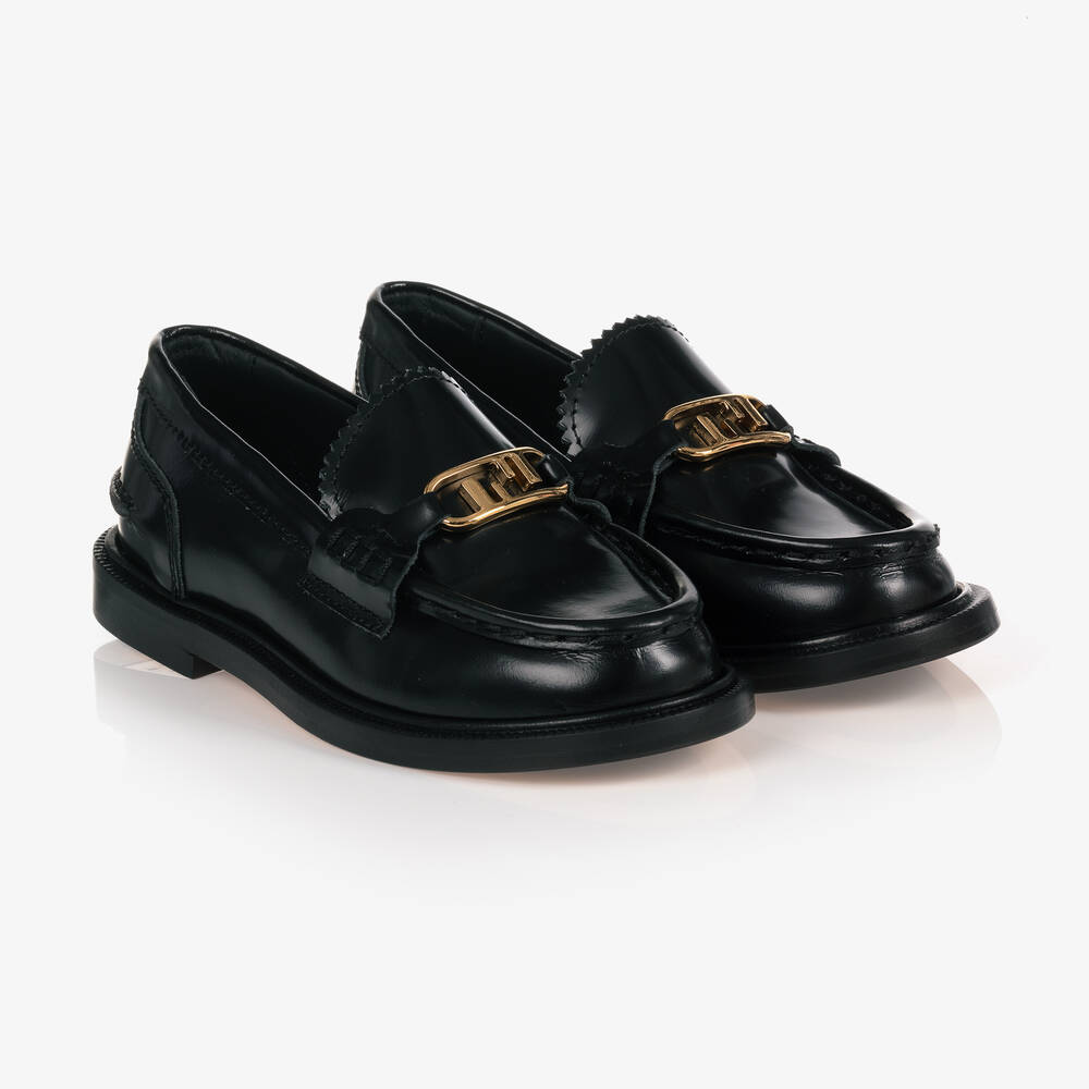 Smart black leather shoes by luxury brand, Fendi. Designed in a classic slip-on loafer style, they have a gold-coloured Fendi O'Lock metalware detail across the front. They are fully lined in leather and have a leather outer sole with non-slip rubber pads.