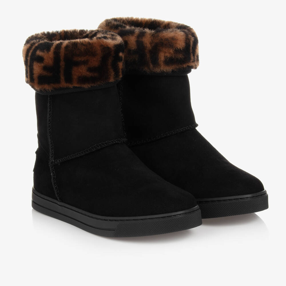 Keeping feet cosy and stylish, these black suede boots for boys and girls are from luxury Italian designer, Fendi. The uppers have overstitching detail and a leather logo tab on the heel. For an unmistakable designer look, they are lined in super soft brown shearling with the brand's signature FF logo pattern. They have flexible rubber soles for added comfort.