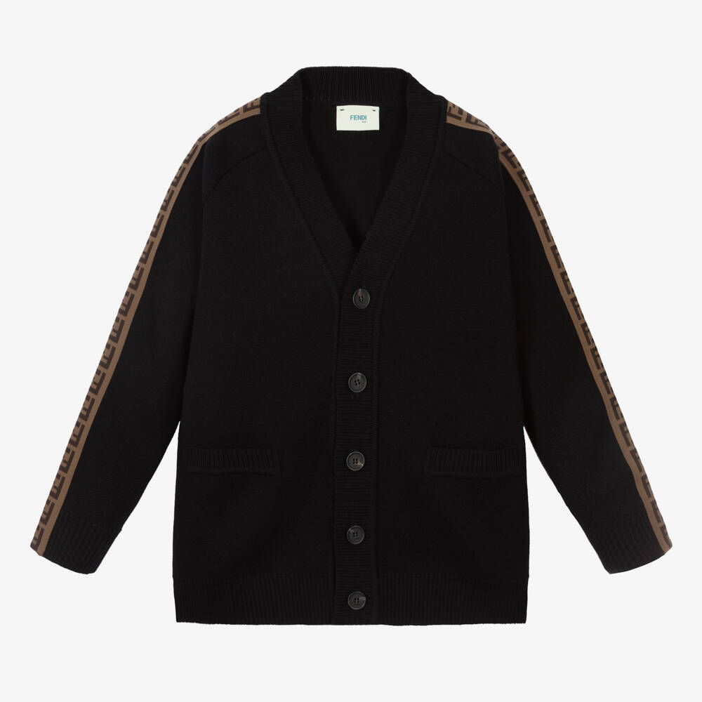 Knitted from soft virgin wool, this black cardigan for boys and girls by luxury brand Fendi. Fastening with buttons and with two front pockets, this stylish cardigan has the designer's iconic brown FF logo taping on the sleeves.