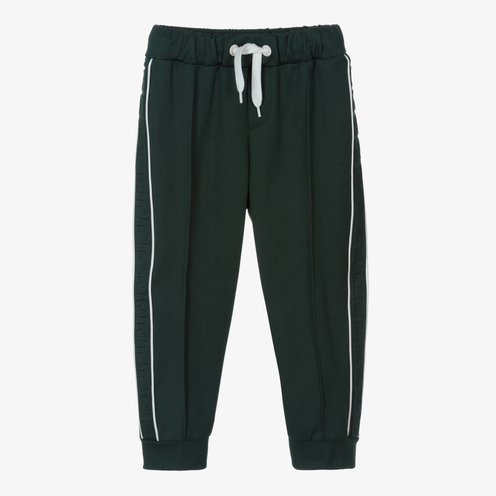 Sporty dark green cuffed joggers for boys, by luxury Italian designer Fendi. Made in soft cotton blend jersey, they are embossed with the brand's signature FF logo on the sides. In the aesthetic of retro sportswear, they have white piped trims and a contrasting white drawstring waist for a comfortable, yet stylish fit.