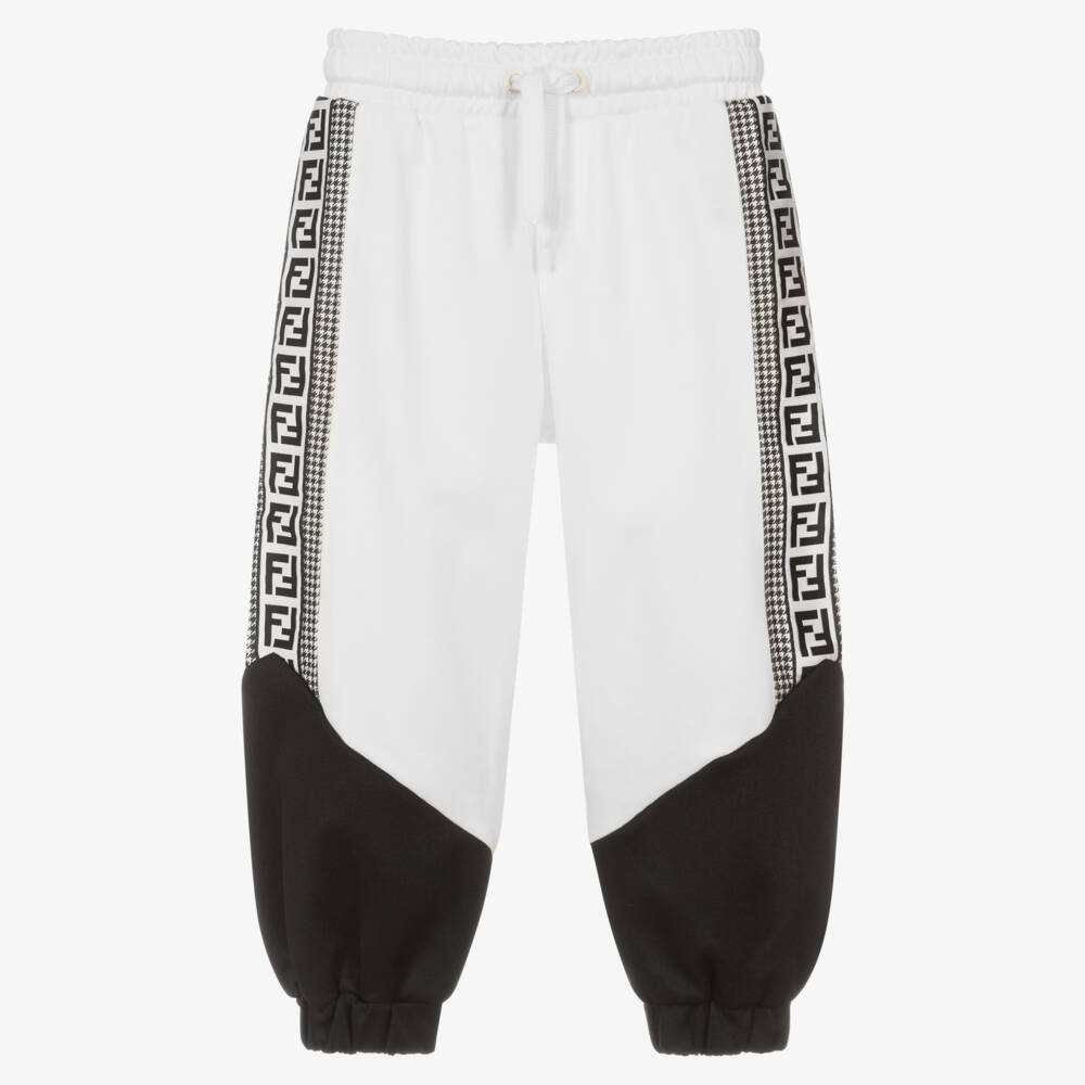 Boys white Mini-me joggers by luxury brand, Fendi. Made in technical jersey, they have contrast houndstooth check and FF logo taping down the legs and black panels on the lower legs. They have an adjustable drawstring waistband for a comfortable fit.