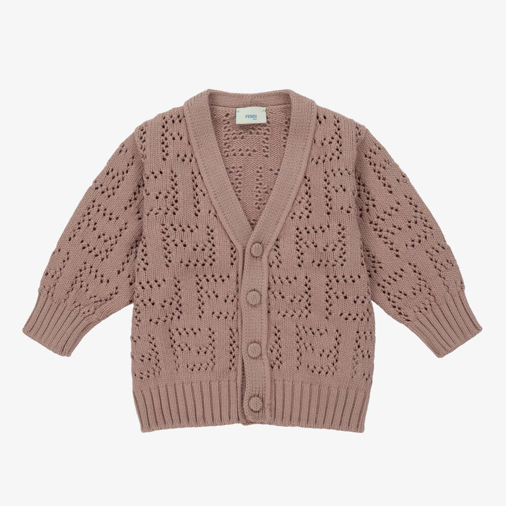 Brown knitted cardigan for baby boys and girls by luxury Italian brand, Fendi. Made with a soft, mid-weight cotton blend knit, this cosy top has the designer's FF logo jacquard pattern, with a ribbed hem and cuffs, and front button fastenings.