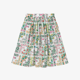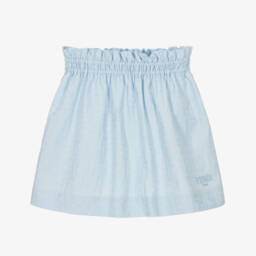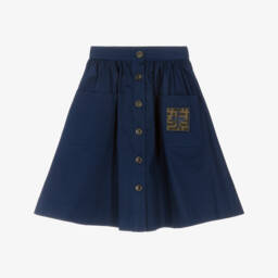 Black skirt for girls by luxury Italian brand Fendi, made in soft and lightweight cotton gabardine. Stylishly pleated, it fastens with a zip on the side and has a contrast brown waistband patterned with FF logos for subtle designer appeal. This cute skirt comes with a micro Fendi Baguette bag, with a popper fastening strap, which can be attached to the skirt on the gold metal D-ring at the front.