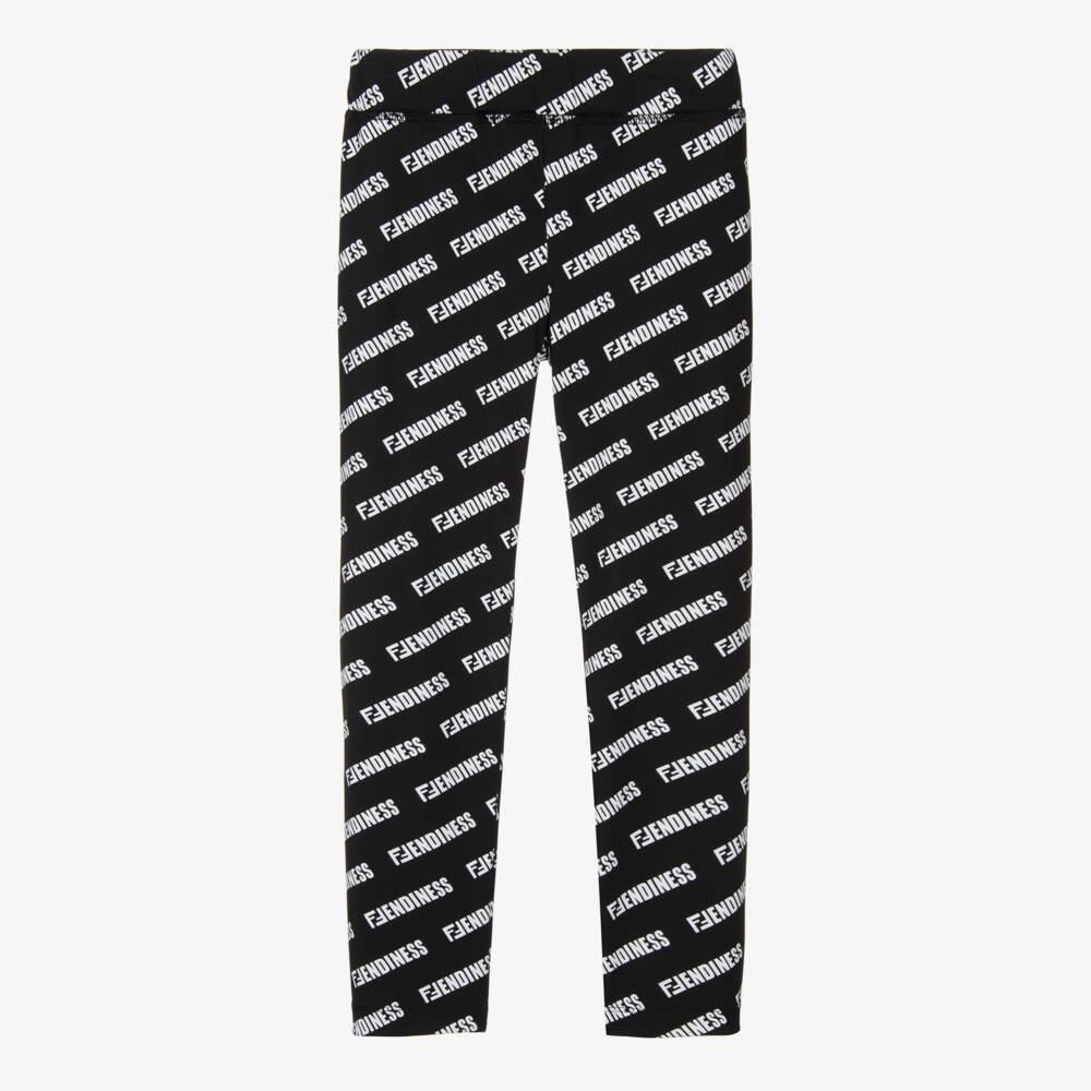 Full length black leggings for girls, unmistakably by luxury Italian designer Fendi. They are patterned with the brand's repeat white Fendiness logo, incorporating the signature FF logo. Made in a lightweight, silky soft polyamide blend jersey, they have a comfortable, elasticated waistband with black overstitch detailing.