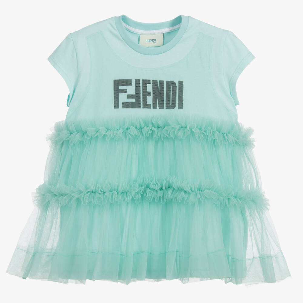 A lovely aqua blue top for girls by luxury Italian designer Fendi. Made from soft and comfortable cotton jersey with a black 'FF' Fendi logo and a ruffled tulle overlay.
