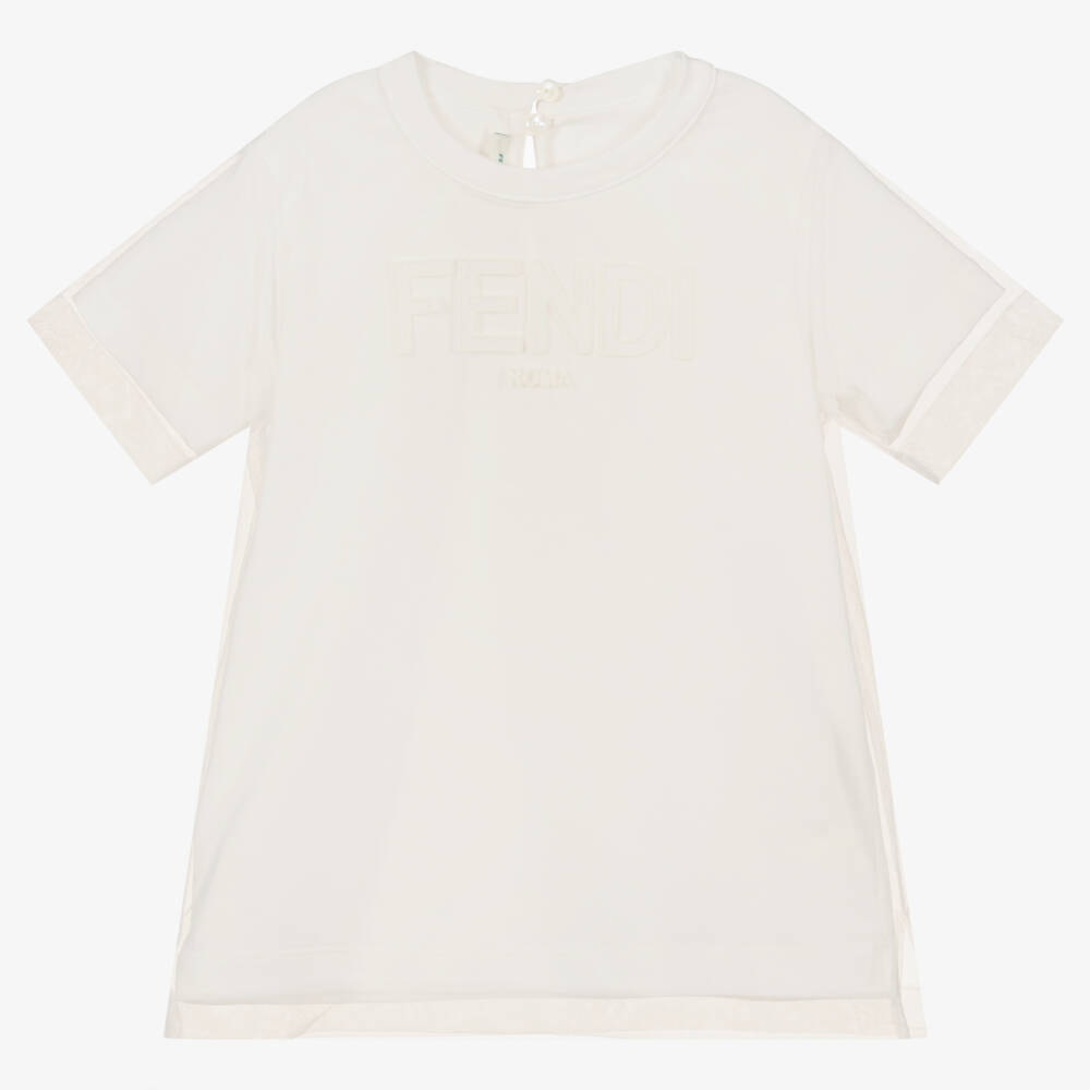 Girls ivory top by luxury brand, Fendi. Inspired by the womenswear collection, this contemporary design is made in stretchy cotton jersey, with a fine tulle overlay embroidered with the designer's logo. There are double button fastenings on the back.