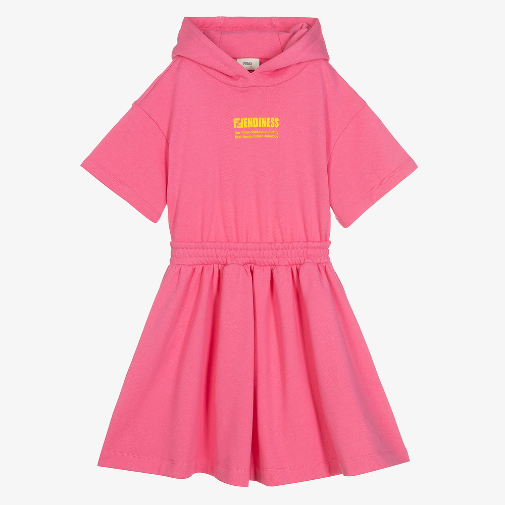 Pink hooded dress for girls by luxury Italian brand Fendi, made in mid-weight cotton jersey. It has an elasticated waistband, with an open design on the back. The designer's 'Fendiness' script logo is on the chest in raised yellow letters.