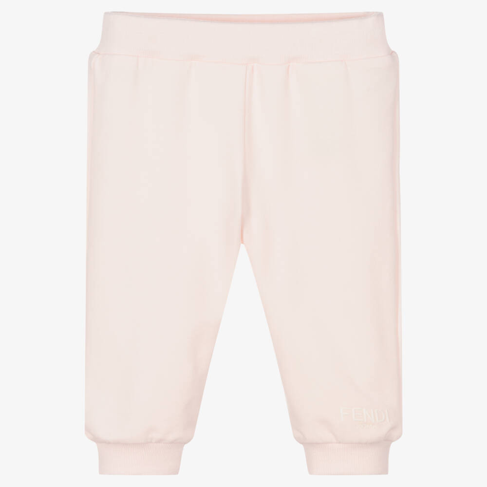 Pale pink joggers for baby girls by luxury Italian brand Fendi. One leg has the Fendi Roma logo embroidered in white by the ribbed cuff. Casual and comfortable, they are made in soft cotton jersey with an elasticated waistband for easy pull-on.
