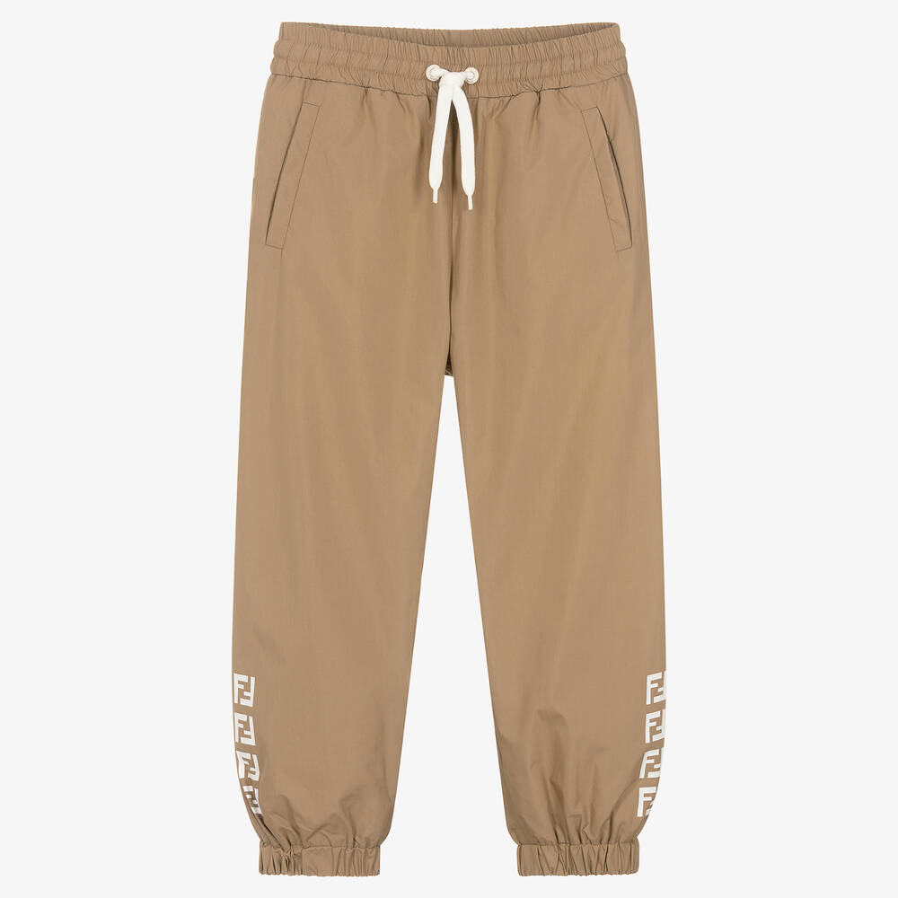 A pair of beige joggers for teen boys and girls by luxury brand Fendi, printed with contrast white FF logos on the legs. Made in a smooth and lightweight cotton blend, these comfortable joggers have useful side pockets and a stretchy drawstring waistband for a desirable fit. They are fully lined in soft cotton jersey, with elasticated cuffs for a sporty appeal.