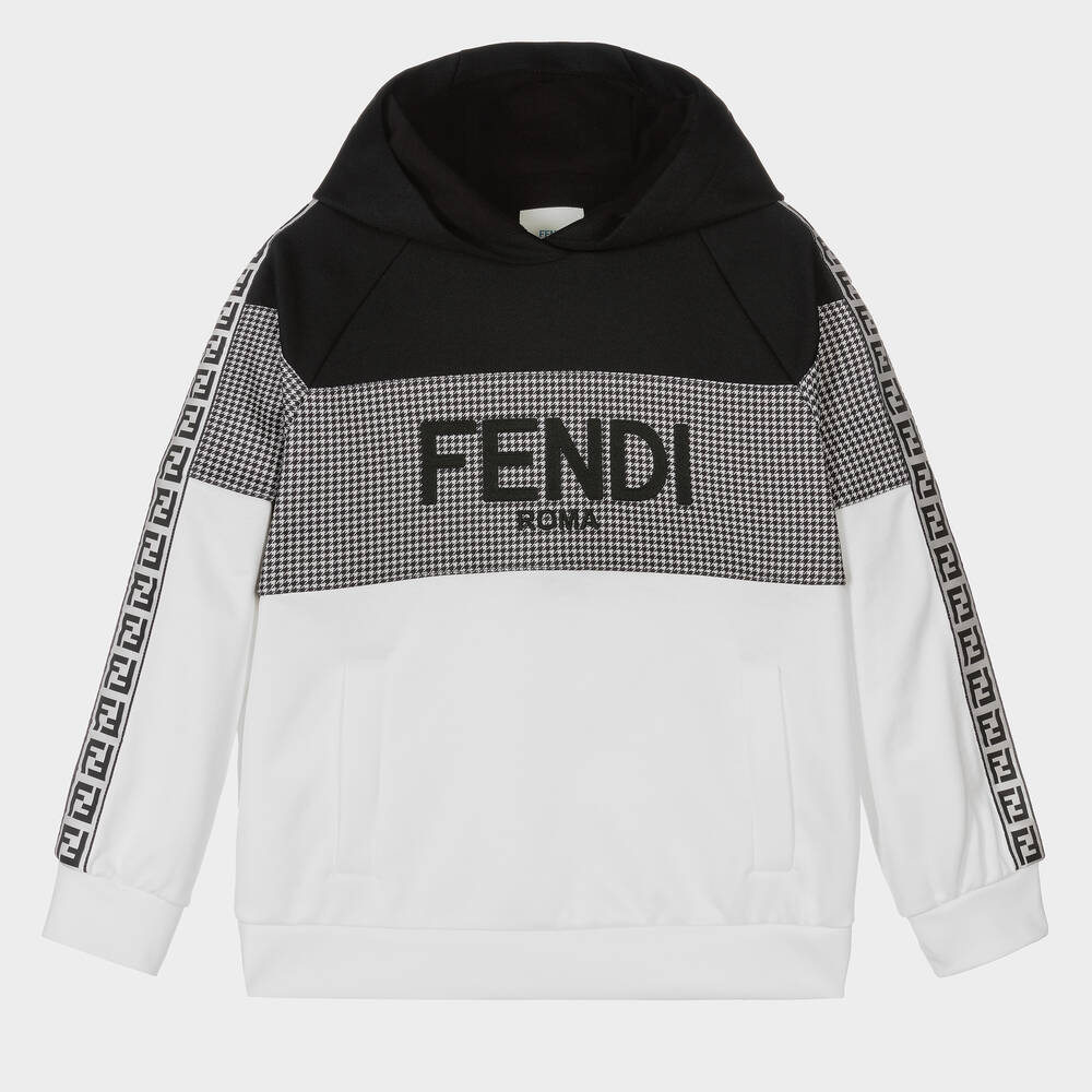 Black and white colourblock Mini-me hoodie for teen boys by luxury Italian brand Fendi. Just right for both relaxing and making a designer statement, it is made in comfortable piqué with the 'Fendi Roma' logo appliqué on a houndstooth check background. With a relaxed fit and raglan sleeves, it has FF logo tape trims on the sides for signature style. There are useful jetted front pockets.