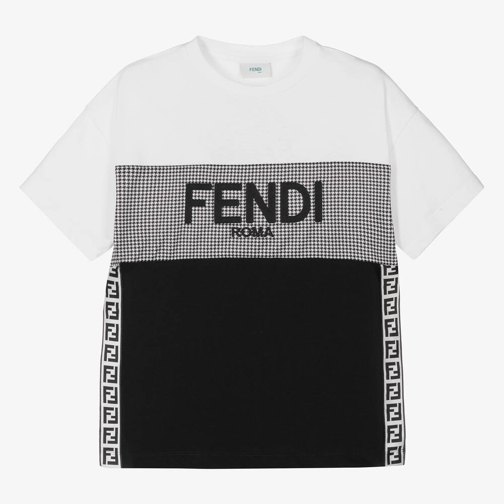 Black and white colourblock Mini-me T-shirt for teen boys by luxury Italian brand Fendi. Just right for both relaxing and making a designer statement, it is made in comfortable cotton jersey with the 'Fendi Roma' logo appliqué on a houndstooth check background. Relaxed with dropped shoulders, it has FF logo tape trims on the sides for signature style.