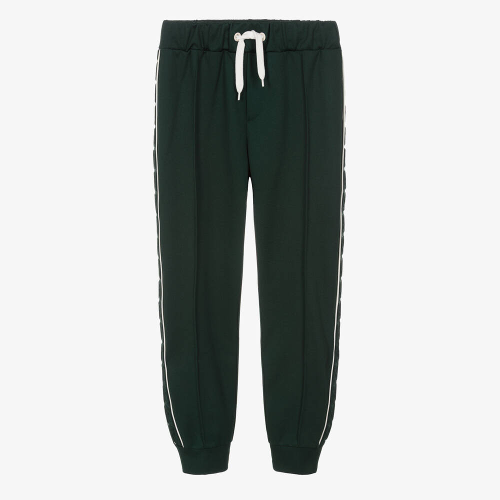 Dark green cuffed jersey joggers for teen boys by luxury designer Fendi, in the aesthetic of retro sportswear. Embossed with the brand's signature FF logo on the sides, they have sporty white piped trims and a logo drawstring waist for a discreet designer detail.