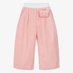 On-trend beige wide-leg trousers for teen girls by Italian brand Fendi, made in a lightweight cotton blend with a luxurious silky feel. A stylish pleated design, they have an elasticated brown FF logo waistband, slanted pockets on the front and a patch pocket on the back.
