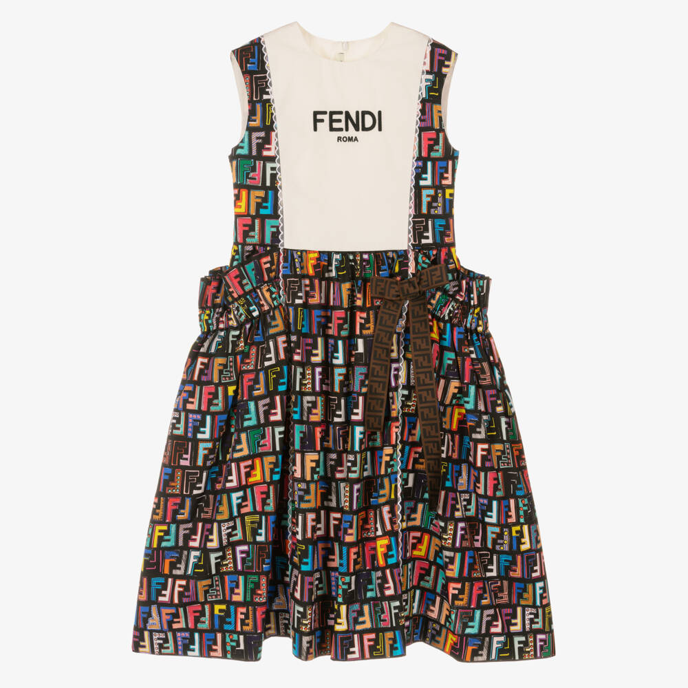 Multicolour FF logo printed dress for teen girls by luxury brand, Fendi. Printed on a black background, this smooth cotton poplin dress has an off-white bib on the bodice, embroidered with the designer's Roma logo. There are two feature side pockets with stretchy ruffles and a flared skirt. A brown FF bow can be attached at the side next to the left pocket with a popper.