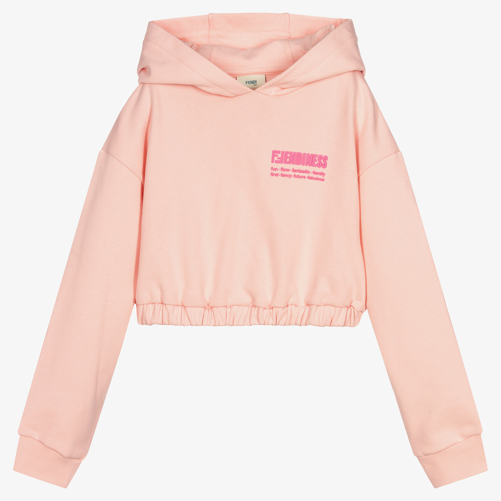 Pale pink cropped hoodie for teen girls by luxury Italian designer Fendi, made in soft cotton sweatshirt jersey. It has a raised pink rubber 'Fendiness' logo print on the front, along with a contemporary elasticated hem for a stylish shape.