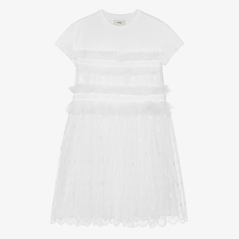 Teen girls will make an instant brand statement in this bright white dress from luxury Italian designer Fendi. An update on a classic T-shirt dress, the crew neck bodice is made from soft cotton jersey with ruffles across the front and around the waistline. With a beautifully scalloped hem, the delicate tulle overlay is embroidered with iconic FF logos in a tonal shade.