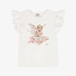 Adorable ivory cotton T-shirt for girls from Flower Fairies™ by Childrensalon, with a beautiful flower fairies in-house designed print in pink from the original illustrations by Cicely Mary Barker. Made in beautifully soft, comfortable jersey, it sparkles with diamantés and has gorgeous poplin ruffles over the shoulders for a finishing flourish.