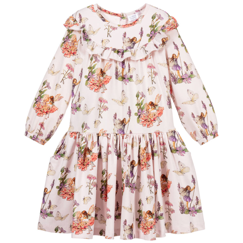 Pink Flower Fairies™ by Childrensalon cotton dress for girls. Made in super soft, comfortable jersey, it has a delightful Flower Fairy print, from the original illustrations by Cicely Mary Barker. The dress has ruffle trims around the bodice, gently elasticated cuffs and fastens on the back with easy-to-use poppers.