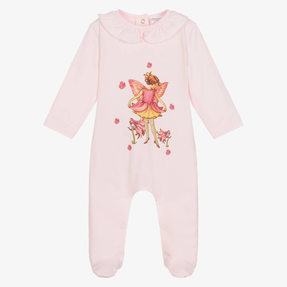 Pale pink cotton babygrow for girls from Flower Fairies™ by Childrensalon, with a pretty ruffle around the neckline. Made in soft, comfortable jersey, it has a charming Flower Fairies and floral print on the front in contrasting pink and yellow, from the original illustrations by Cicely Mary Barker.