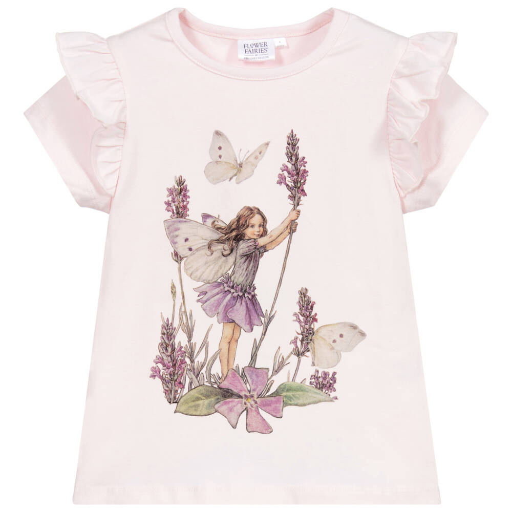 Pink Flower Fairies™ by Childrensalon cotton T-shirt for girls, made in super soft, comfortable jersey. It has pretty ruffles over the shoulders and a delightful purple Flower Fairies print from the original illustrations by Cicely Mary Barker on the front.