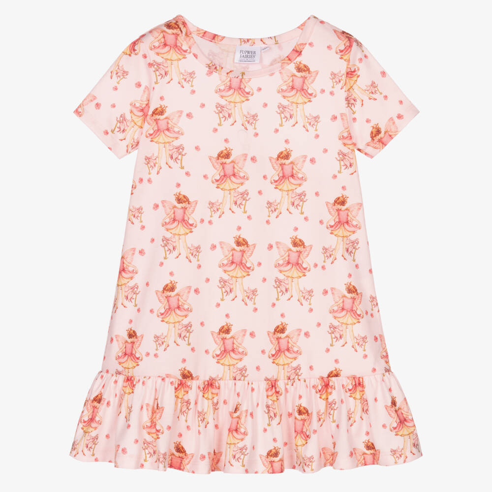 Pink jersey nightdress for girls from Flower Fairies™ by Childrensalon, with a frilled hemline. Super soft, stretchy and lightweight, it has a charming Flower Fairies and floral print in contrasting pink from the original illustrations by Cicely Mary Barker.