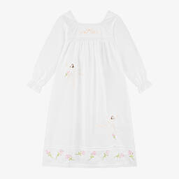 This white cotton nightdress by Flower Fairies™ by Childrensalon gives a charming, personalised touch to girl's bedtime, with your child's name embroidered on the chest. It features delicate embroidered pink fairy images taken from the original illustrations by Cicely Mary Barker along the hemline. Ideal for a comfortable night’s sleep, it is made in luxurious cotton blended with flame-retardant fibres, free from harmful chemicals and brushed for extra softness. It has a pretty ruffled collar, pale pink picot trims and is gathered below the bodice, which fastens with glittery pink buttons.