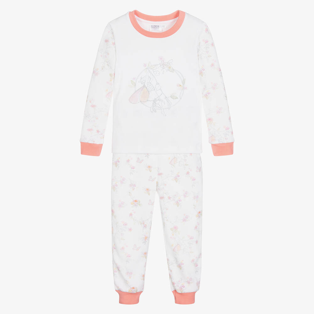 Enchanting white Flower Fairies™ by Childrensalon cotton pyjamas for girls, with pink ribbed trims. Made in super soft, comfortable jersey, they have a delightful Flower Fairies and floral print in contrasting pink and green from the original illustrations by Cicely Mary Barker.