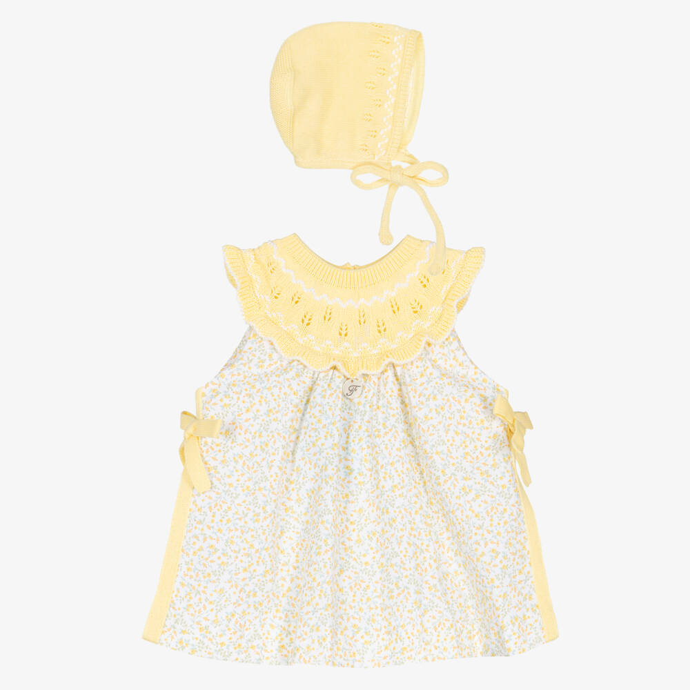 Sweet summery dress set for baby girls by classic brand Foque, with a yellow and green ditsy floral print. Made in cool, lightweight cotton, it has a knitted yellow bodice, with matching bows and trims on the open sides. A matching hat and floral bloomers complete the look.
