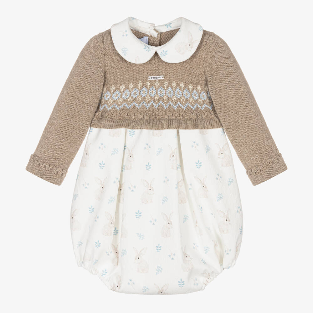 An adorable beige and ivory shortie for baby boys and girls by Foque, with a beautifully soft knitted bodice. Made to look like two pieces, the beige upper has a sweet Fair Isle pattern on the front and raised knitted trims for added texture. In contrasting needlecord, the Peter Pan collar and lower body are patterned with pale beige bunny rabbits and sweet blue flowers. Lined for a gentle feel against the skin, there are mother-of-pearl buttons on the back and between the legs.