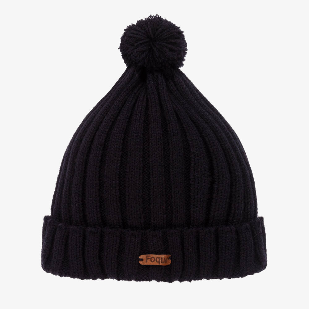 Navy blue hat for boys and girls from Foque. Cosy and comfy, it is knitted in soft acrylic. There is a brown logo tab on the front, with a small navy blue pom-pom on the top.