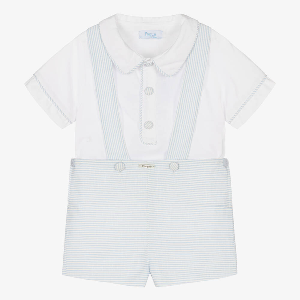 White and blue shorts set for little boys by Spanish brand, Foque. The shirt is made in comfortable lightweight cotton, with striped piping trim and a half placket with covered buttons. It pairs with sweet striped shorts that are made in a lightweight linen and cotton blend, with a full lining for comfort. For a versatile look, the shoulder straps can be removed and the shorts fasten with buttons at the sides.
