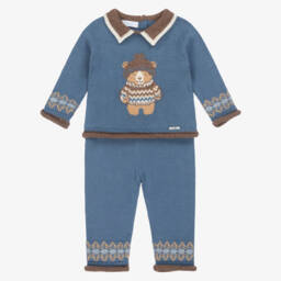 Boys two-piece cotton trouser set from Foque. The pale blue shirt has stylish tartan trims and an embroidered yacht on the chest. It has a button-down collar and fastenings on the front and cuffs. The navy blue chino-style trousers have a lovely washed finish and a slight stretch for comfort. Styled with pockets on the front and back, they fasten with a zip and button and have a useful, adjustable waistband.