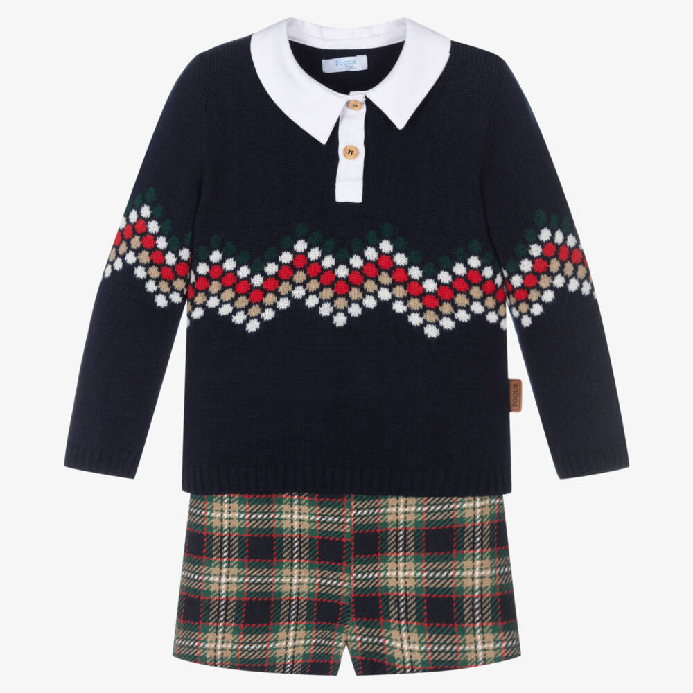 Smart and classic, this navy blue shorts set for little boys is by Spanish brand Foque. Knitted in the softest wool blend, the sweater has a white polo-style collar, a colourful zig zag design and wooden button fastenings. The woven cotton shorts come in a tartan check design, securing with buttons on the side. They are finished with an adjustable waist ad a soft voile lining.