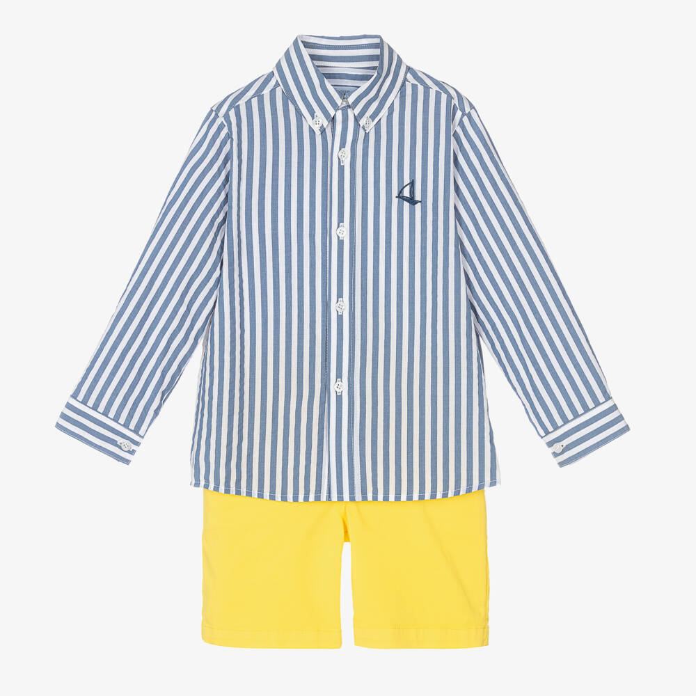 Smart casual shirt and shorts set for boys by Foque, made with cotton for comfortable wear. The lightweight blue and white striped shirt has a button-down collar and a navy blue embroidered yacht on the chest. In contrasting bright yellow for an eye-catching look, the twill shorts have chino-style pockets on the front and back. Fastening with a zip and button, the shorts have useful belt loops and an adjustable waist for a great fit.