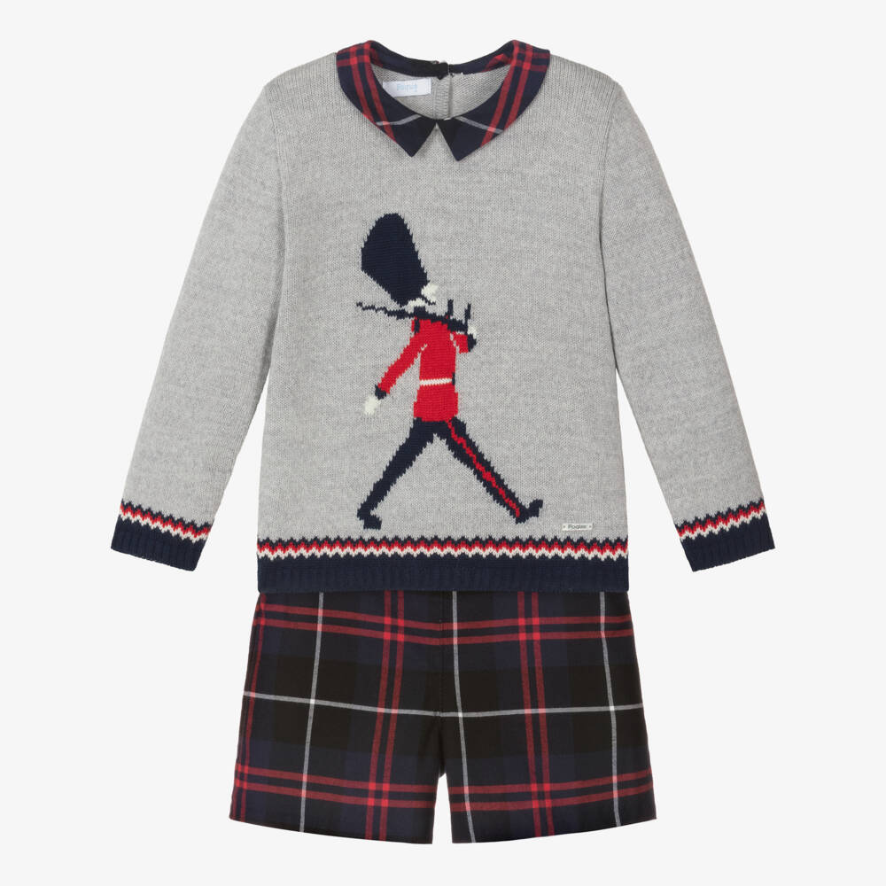 A charming grey and navy blue shorts set for boys by Foque. Made from a soft wool-blend knit, the sweater has a lovely soldier design on the chest and zigzag trims on the cuffs and the hemline. It fastens with buttons on the back and has a lovely check twill collar to match the shorts. Fully lined, the shorts have a comfortable adjustable waist and button fastenings on the sides.