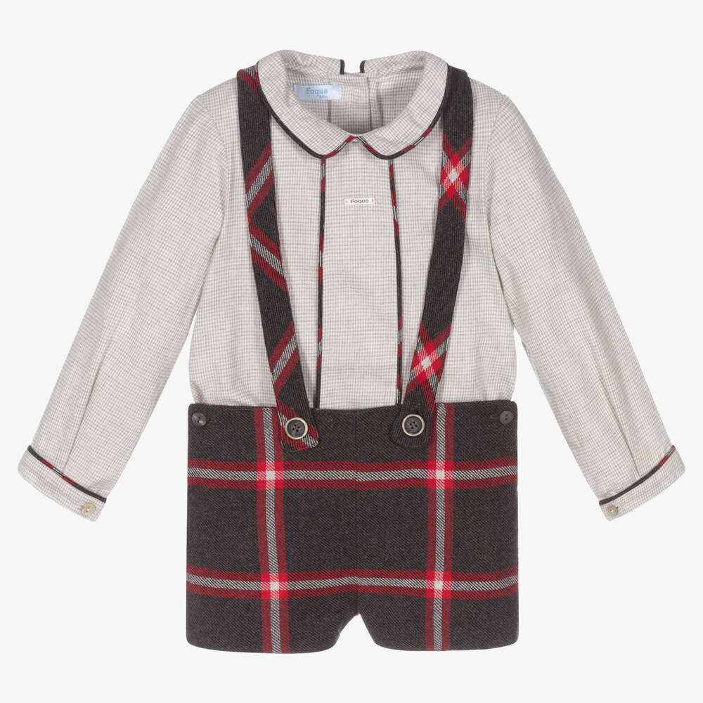 Grey and red shorts set for younger boys by Foque. Made in soft, mid-weight cotton twill, the pale grey houndstooth shirt has grey and red check trims on the collar, placket and cuffs. The grey and red check wool-blend shorts have removable button fastening shoulder straps, a voile lining, and an elasticated waist around the back.
