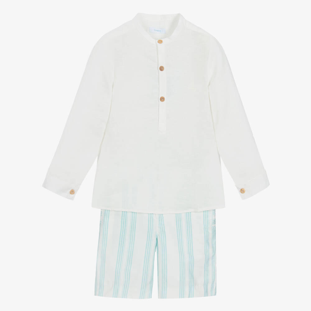 Smart ivory and turquoise blue striped shorts for boys by Foque, exclusive to Childrensalon. Woven in soft and lightweight cotton, the collarless style has a sailing boat embroidered on the chest in ivory and wooden buttons on the front. This traditional set comes with blue striped twill shorts to complete the timeless look. They fastens with a simple button and zip on the front, and have an adjustable waist for comfort.