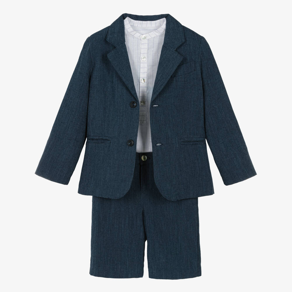 A navy blue and white shorts suit for boys by Spanish brand Foque, timeless for special occasion styling. The smart linen-blend blazer has a single-breasted design with button fastenings and front pockets. Creating a coordinated look, the shorts have pockets and an adjustable waistband, fastening neatly with a mother-of-pearl button and zip. A collarless stripe shirt completes the outfit, with an embroidered sailing boat, front button fastenings and roll-up sleeves that secure with buttons.