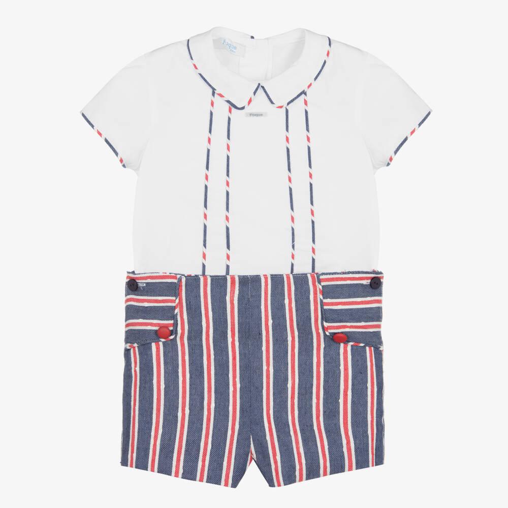 Smart-casual blue striped shorts set for younger boys from Foque. The white cotton poplin shirt has pin tuck detailing on the front and fastens with buttons on the back for a neat finish. The piping trim on the shirt is a contrast blue and red stripe which matches the shorts for a complete look. Lined for comfort, the tailored twill shorts have button fastenings on the sides, along with an adjustable waist that can be altered for a preferred fit.