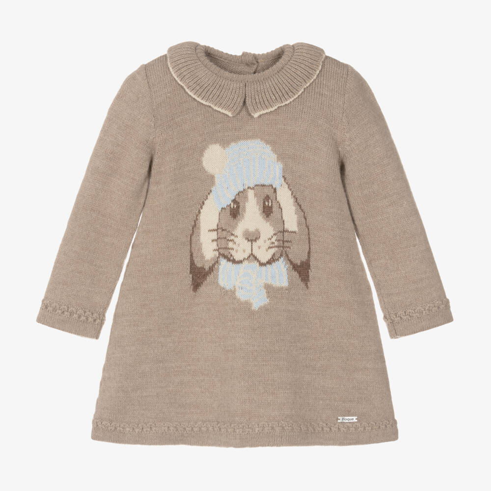 Exclusive to Childrensalon, this charming beige dress for little girls is by Foque. Made from a soft alpaca-blend knit, this long-sleeved dress is warm and cosy, ideal for the cooler months. Complete with a sweet collar, there is an adorable floppy-eared bunny rabbit design on the front, wearing a stripey pale blue hat and scarf. It fastens with buttons on the back for a neat finish, and there is a mother-of-pearl logo tab near the hemline.